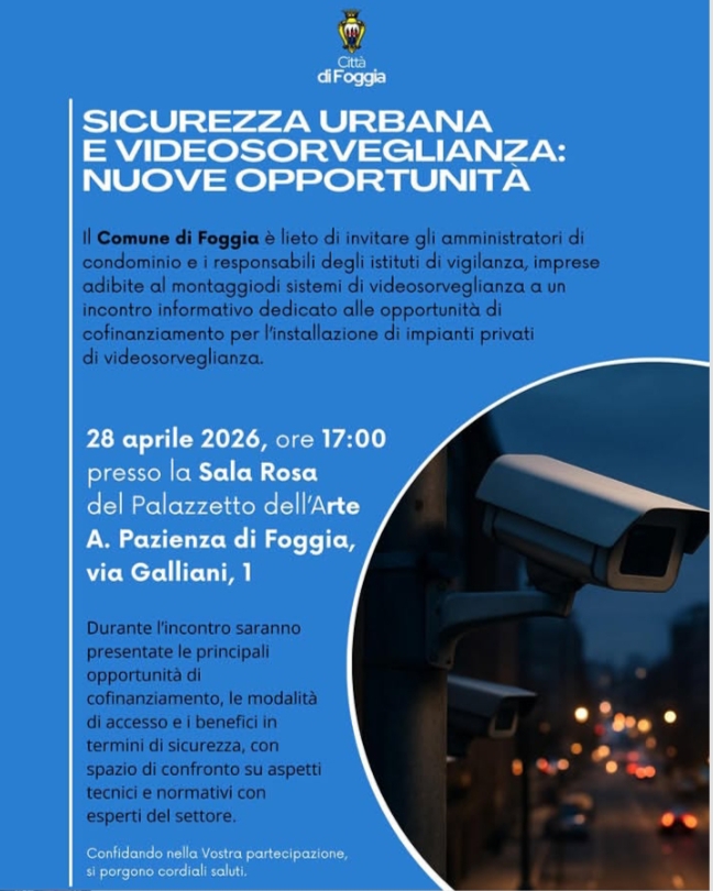 Il Comune di Foggia ha organizzato un incontro informativo dedicato alle opportunità di cofinanziamento garantite dal Progetto “Sicurezza Partecipata- Rete Integrata di Videosorveglianza” per l’installazione di impianti privati di videosorveglianza, rivolto agli amministratori di condominio, ai responsabili degli istituti di vigilanza e alle imprese adibite al montaggio di sistemi di videosorveglianza.