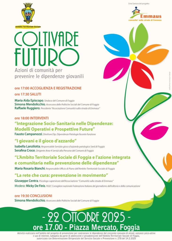 Al termine, Maria Rosaria Bianchi, Responsabile Ufficio di Piano dell’ATS di Foggia, illustrerà “l’Ambito Territoriale Sociale di Foggia e l’azione integrata e comunitaria nella prevenzione delle dipendenze”.