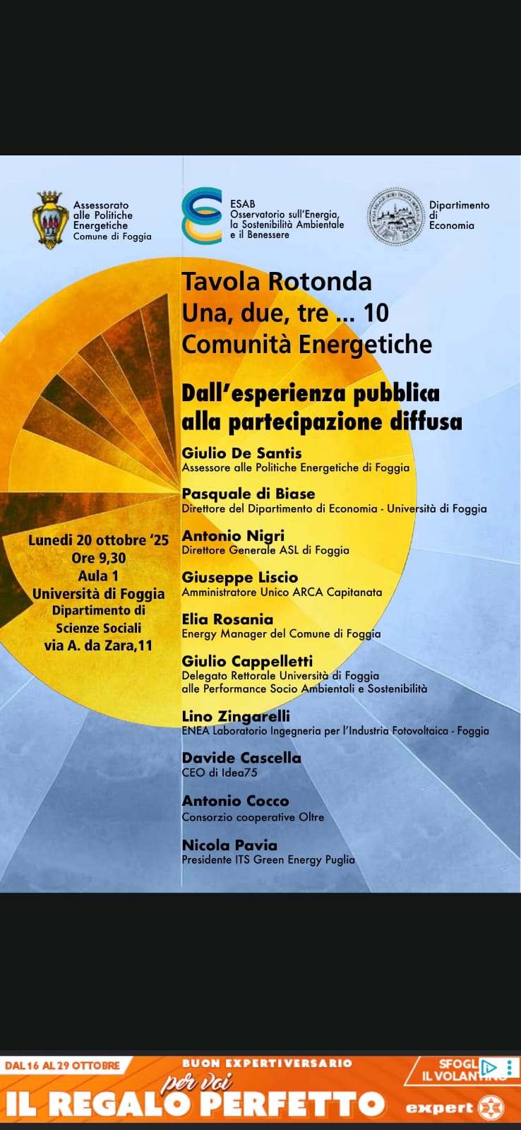 Si è svolta questa mattina, presso l’aula 1 del Dipartimento di Scienze Sociali dell’Università degli Studi di Foggia, la tavola rotonda organizzata dall’Assessorato alle Politiche Energetiche del Comune di Foggia, dall’ESAB – Osservatore sull’Energia, la Sostenibilità Ambientale e il Benessere, e dal Dipartimento di Economia dell’Università di Foggia.
