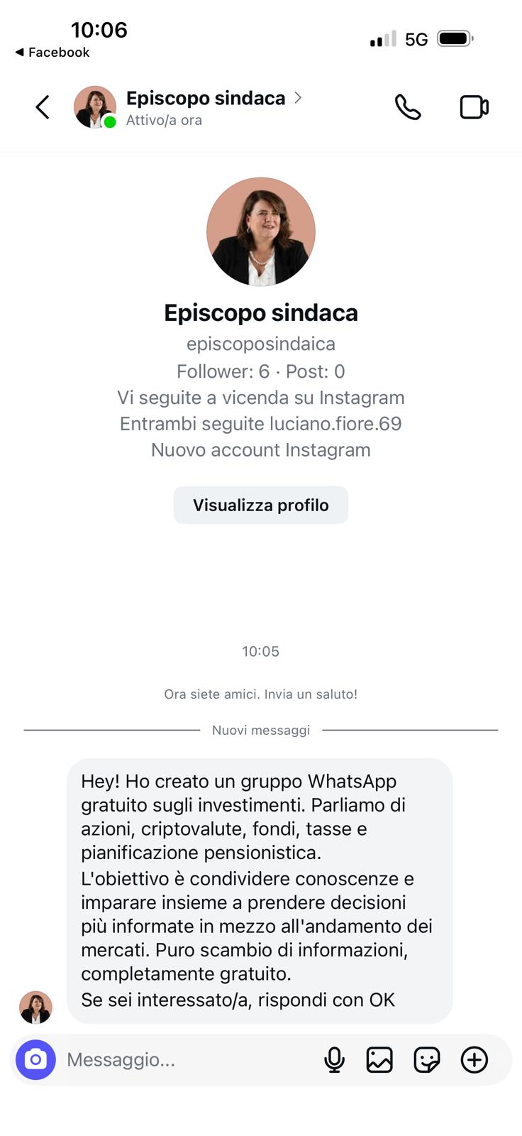 Un profilo fake ‘Episcopo Sindaca’ da questa mattina sul social network Instagram sta contattando, con messaggi privati e richieste di amicizia, persone ignare che si tratti di una truffa. Nei messaggi si fa riferimento alla volontà di creare “un gruppo WhatsApp sugli investimenti”, con discussioni inerenti “azioni, criptovalute, fondi, tasse e pianificazione pensionistica”, lontanissima dal ruolo, dal profilo pubblico e dal rigore morale della sindaca.